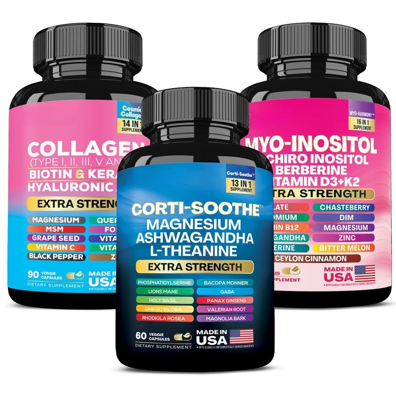 Join the thousands of women who have transformed their daily health with the Ultimate Women's All-in-One Supplement Trio – your solution for stress relief, hormonal balance, and beauty from within.